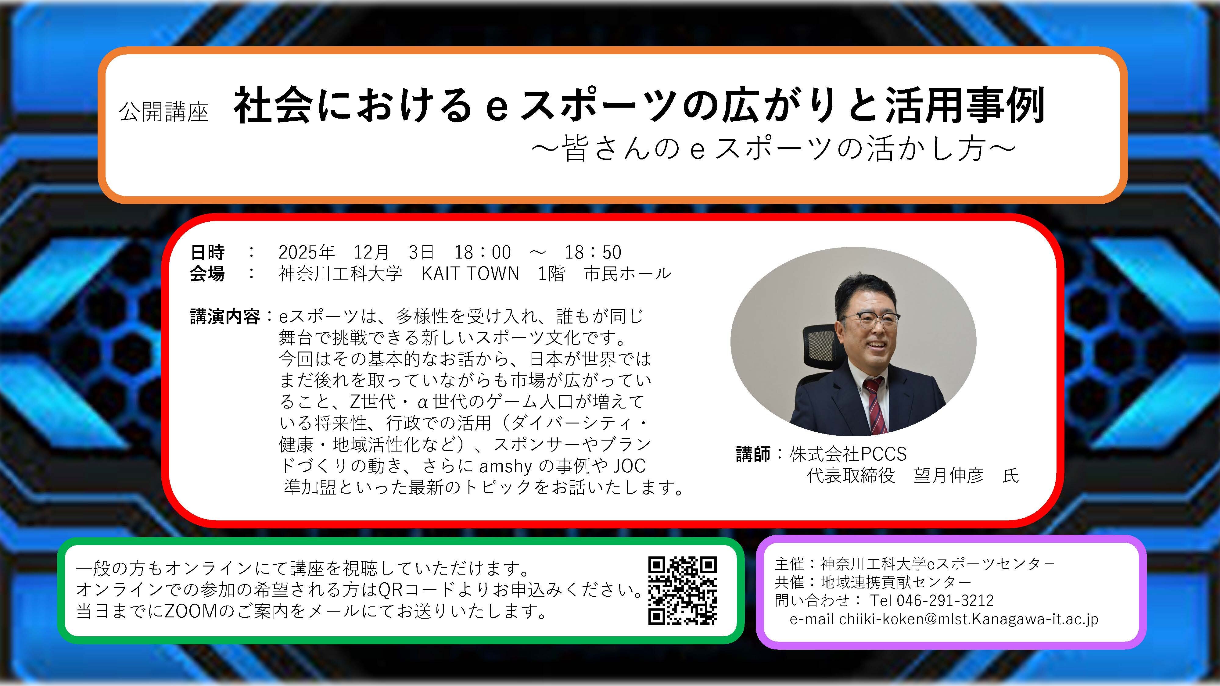 12月3日(水)にeスポーツセンター主催の公開講座が行われます。学生はもちろん、一般の方もオンラインにてご視聴いただけます。