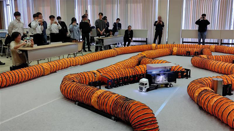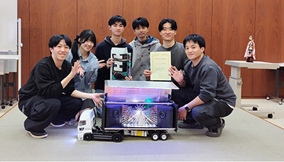 走行時間は2分間で「エキスパートクラス」と「エントリクラス」それぞれ周数を競います。車両の大きさは1/10と1/28がありますが同じコースを走行しました。エキスパートクラスでは「KAIT AI Racing」(機械工学科)が優勝しました。コンクールデレガンス(デザイン賞)には、「ひなげし過激団」(電気電子情報工学科)が受賞しました。この「デコトラ」は、走行中にコンテナを開いて不安定な状態にもかかわらず電飾や大音量の音楽を流しながらカーブを走り抜けるなど会場が大いに盛り上がりました。