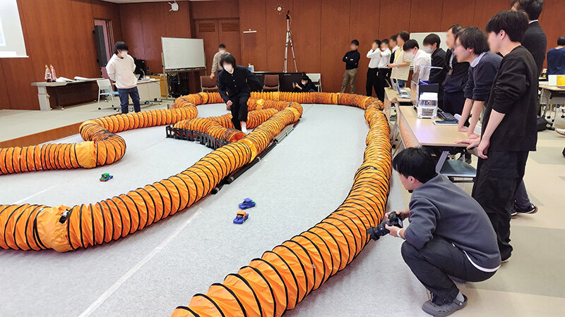 3月21日(土)第9回「AIが走らせる自動運転ラジコンカーレースKAIT Racer GP」を学内で開催しました。本大会は、学生が自ら製作した車両・AI・運動制御による性能を競うことで、情報学と工学の融合を学ぶ場を提供し、産業の新たな発展に貢献できる人材を育成することを目的としています。今回は、県内外(遠方の高校は愛知県や静岡県)から大学生チーム、高校生チーム、社会人チームの合計11チームが参加しました。
