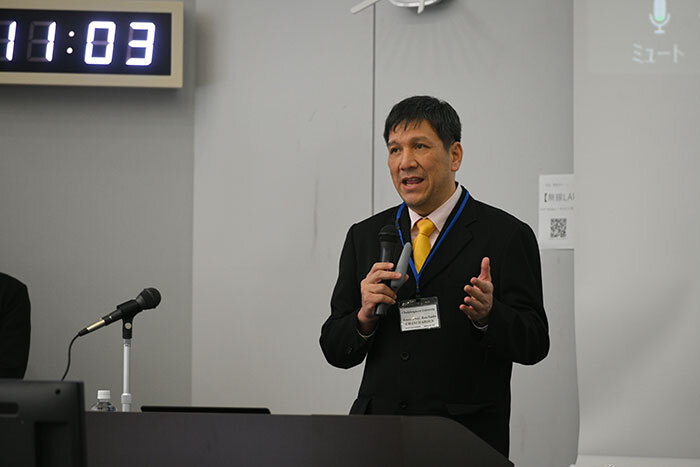 続いて行われた特別講演では、海外協定校の1つで、研究や研修生を通して以前から本学と関わりが深いタイ王国のチュラロンコーン大学(Chulalongkorn University)のRatchatin CHANCHAROEN准教授が登壇いただきました。多くの研修生を受け入れるとともに研究を通して築いてきた、過去10年に渡る同大学と本学の交流の実績、そして、次の10年に向けての計画を「私たちのコラボレーションは未来を歩むための鍵です」という言葉と共に紹介されました。