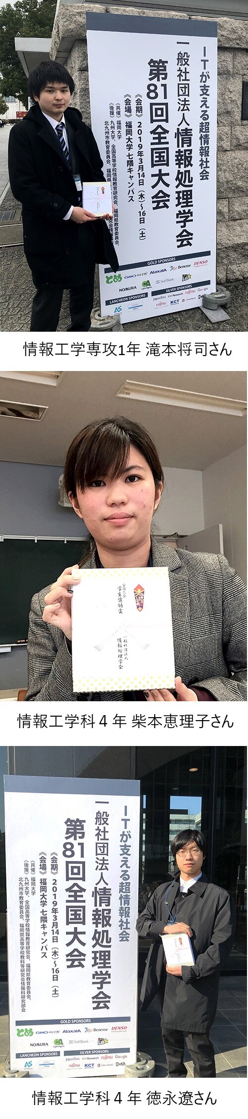 第81回情報処理学会全国大会で、情報工学専攻1年滝本将司さん、情報工学科4年の柴本恵理子さん、徳永遼さんが、学生奨励賞を受賞しました。