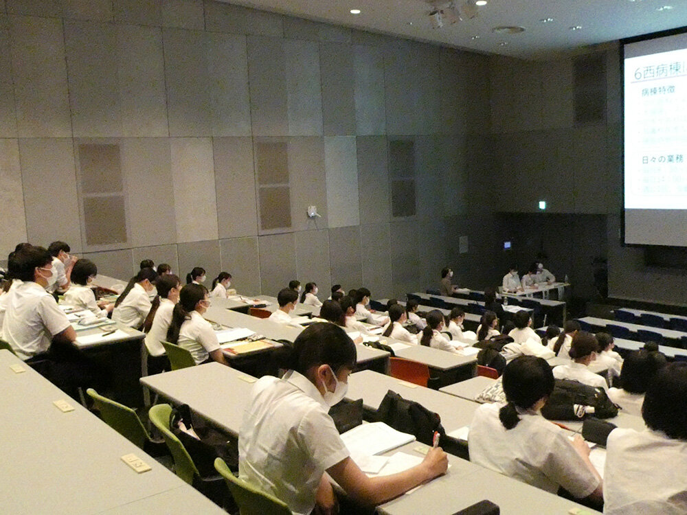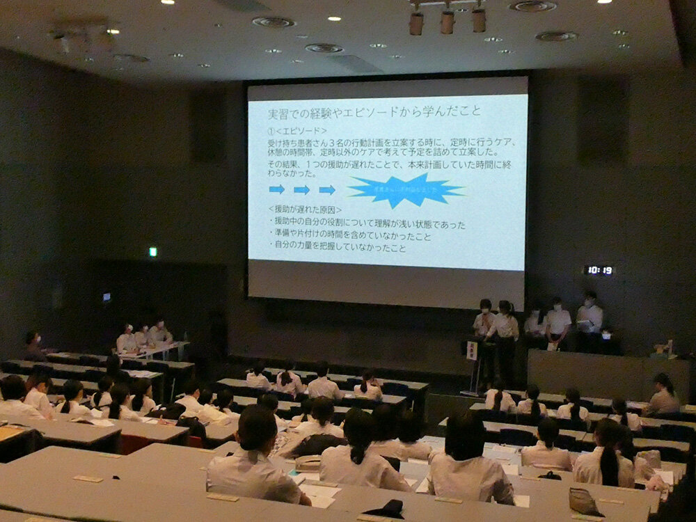 発表は、実習施設ごとのグループで行われ、複数対象の受け持ちや各種実習を通して得た学びについて共有されました。学生たちは、複数患者の受け持ち、夜間実習、看護管理者のシャドーイングを通して看護の継続性、チーム連携の重要性などを明確にし、臨地実習で得た学びや気づきを考察し、看護の専門性や自己の成長に向けた課題をまとめ、共有する貴重な機会となりました。
