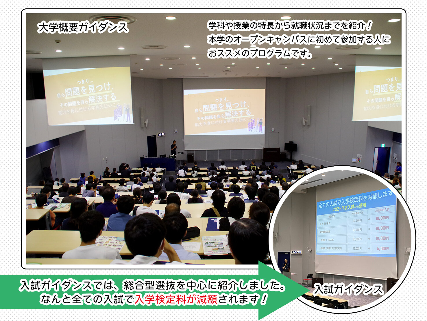大学概要ガイダンスでは、「経験値」を大切にする本学のカリキュラムなどについて、入試説明ガイダンスでは、総合型選抜を中心に各入試方式の特徴と留意したいポイントを紹介しました。また、保護者対象ガイダンスや「入試ポイントを徹底解説!入試対策をマスターしよう」も実施しました。
