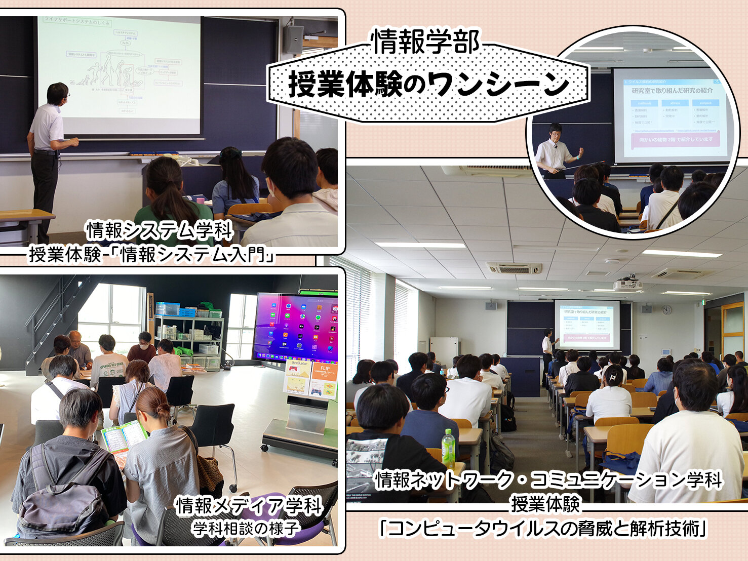 学科相談では、各学科の先生が学科の特長やカリキュラムについての紹介し、個別相談も実施しました。授業体験は、午前中に15コマ、午後16コマの模擬授業を行いました。ここではその一部をご紹介します。