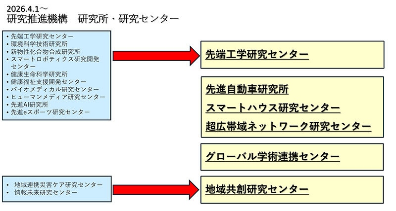 本学では、研究推進機構の研究所・研究センター体制を見直し、2026年4月より新たな体制へ移行しました。