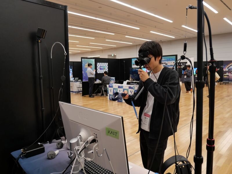 2025年12月1日〜3日、東京都立産業貿易センター浜松町館で開催されたバーチャル領域(XR / メタバース /VTuber)を扱う国内随一の業界カンファレンス「XR Kaigi 2025」に、情報学部 情報ネットワーク・コミュニケーション学科 瀬林研究室 山本 和矢さん(4年)を中心としたチームが出展しました。企業中心のイベントの中で、大学としての出展は本学のみでした。XR kaigiには2023年から3年連続で出展しています。