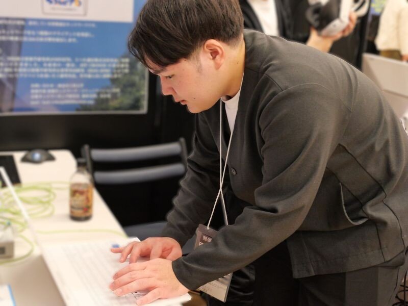 12/2は情報ネットワーク・コミュニケーション学科の2年生 寺島新太さんもブースに立ちました。研究室への正式な所属は3年生からですが、情報学部棟1階にはネットワーク工房があり、サークル活動のような形でネットワークに興味を持つ学生が学年・学科を問わず交流し、外部講師を招いた講義を受ける機会もあります。その中で瀬林研究室の先輩方とのつながりが生まれ、今回の展示を手伝うことになりました。「忙しい中でも、先輩が分かりやすく教えてくださっています」と話してくださいました。