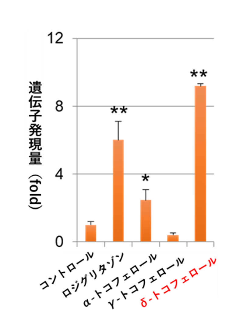 マウスの前駆脂肪細胞(3T3-L1細胞)にさまざまなビタミンE同族体を添加した際に、UCP1遺伝子が発現するかを調べました。もしもUCP1遺伝子が発現していれば、脂肪細胞がベージュ脂肪細胞へ分化したと考えられます。実験の結果、δ-トコフェロールを添加した場合、UCP1の遺伝子発現が大きく増加することがわかりました。この効果は、既知のベージュ化誘導物質であるロジグリタゾンと同等、またはそれ以上でした(図2)。この実験から、ビタミンE同族体の中でδ-トコフェロールは脂肪細胞のベージュ化を誘導することが示されました。さらに、δ-トコフェロールがどのようにして分化誘導に働くか調べたところ、転写因子(遺伝子発現をコントロールする遺伝子)を活性化することにより分化を引き起こすことがわかりました。