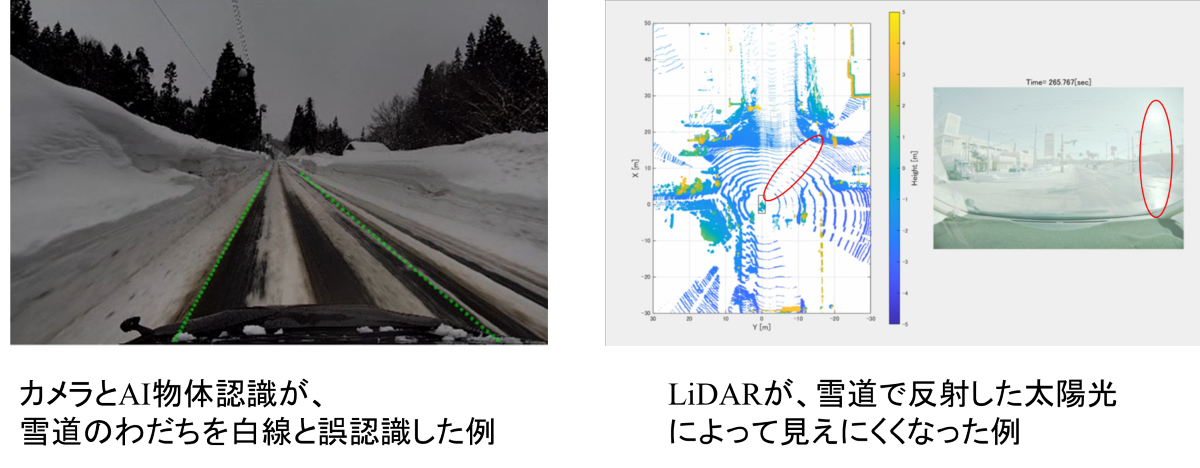 自動運転で「眼」の役割を担うセンサは3種類あります。カメラ、LiDAR(ライダー)、ミリ波レーダです。自動運転車では、カメラが道路の白線を検知して、車線のなかを走行するよう制御しますが、道路に積雪があると雪を白線と誤認識する場合があります。またLiDARは雪で反射された強い太陽光で受光部が飽和して物標が見えにくくなる場合があるなどの課題があります(図1)。