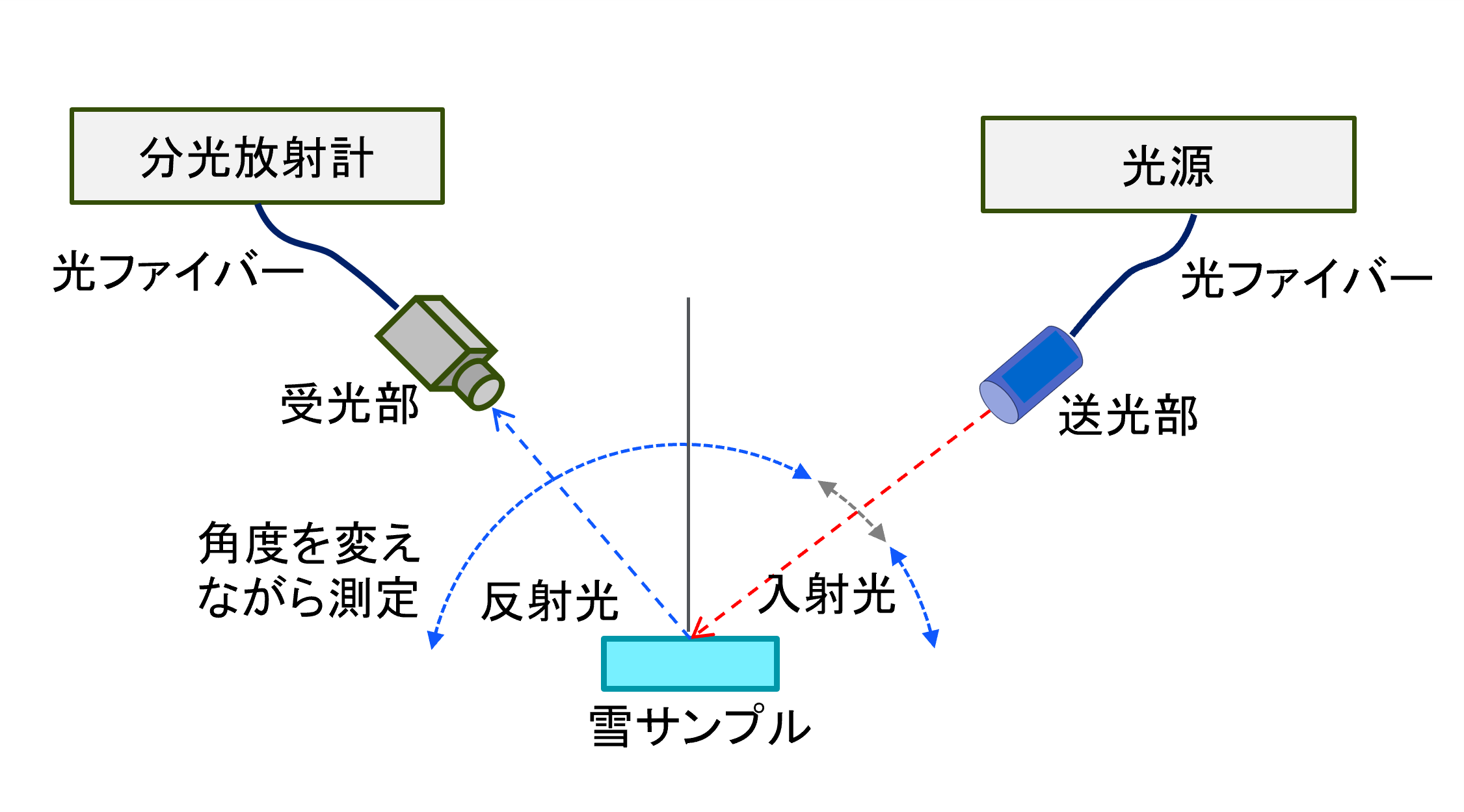 雪に対する光の反射の基本特性を計測するには、雪サンプルへ光を照射して、反射された光の強さを分光放射計で測定します(図2)。この一連の計測を、送光部と受光部の設置角度を変えながら行います。実際の実験では、雪サンプルが溶けるのを防ぐため、雪サンプルと計測に必要な最小限の装置類を低温室に設置し、高精度な計測装置は常温の制御室に設置して、それらを長いケーブルで接続して実験しています。低温環境下での高精度な実験ではこのように様々な工夫を施して実験することが必要です。