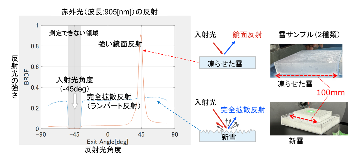 光が反射される強さは、双方向反射率分布関数(BRDF:Bidirectional Reflectance Distribution Function)という値で表現されます。図3に示したグラフは、入射する光の角度は45deg一定で、受光部の設置角度を変えながら反射光の強さを測定した結果です。新雪に対する光の反射は、入射光や出射光の角度に依らず一定の強さで光を反射する、完全拡散反射(ランバート反射)の特性が観測されました。一方、凍らせた雪では、拡散反射ではなく、入射角度のちょうど反対側に強い鏡面反射の特性を持つことが分かりました。この実験で、雪の状態によって光の反射特性が大きく変化することが明らかになりました。