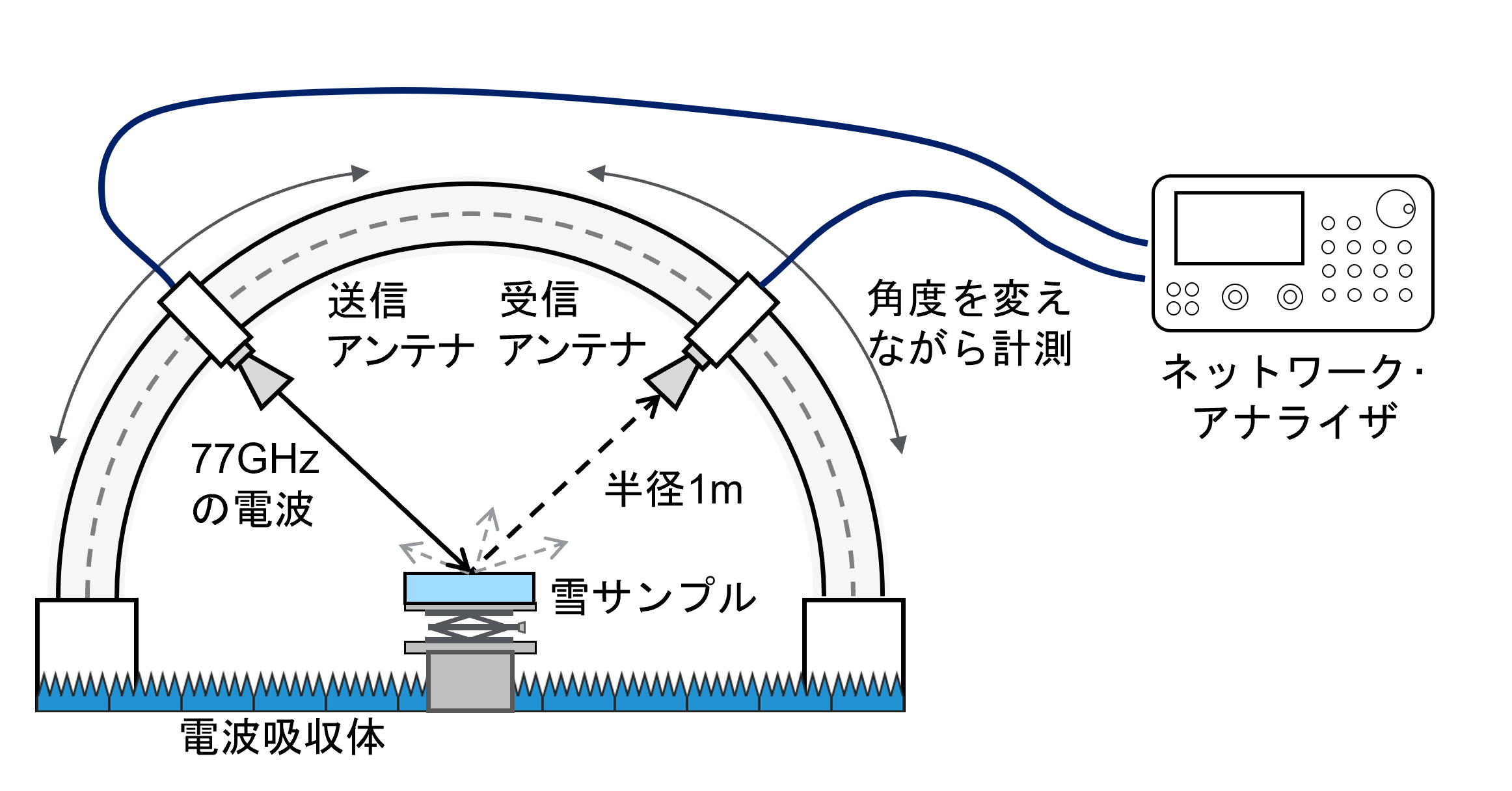 次に、雪に対する電波の反射特性を測定しました。前述のように自動車で使われているレーダでは、周波数77GHzの電波が使われています。この電波を雪サンプルに照射して反射特性を計測します。電波の反射の計測にはネットワーク・アナライザと呼ばれる装置を使います。ネットワーク・アナライザは、電波を制御しながら送信し、受信された信号の特性から雪サンプルの反射の強さを計測できる装置です。送信アンテナと受信アンテナを設置する角度を変えながら、雪サンプルの反射特性を測定しました(図4)。