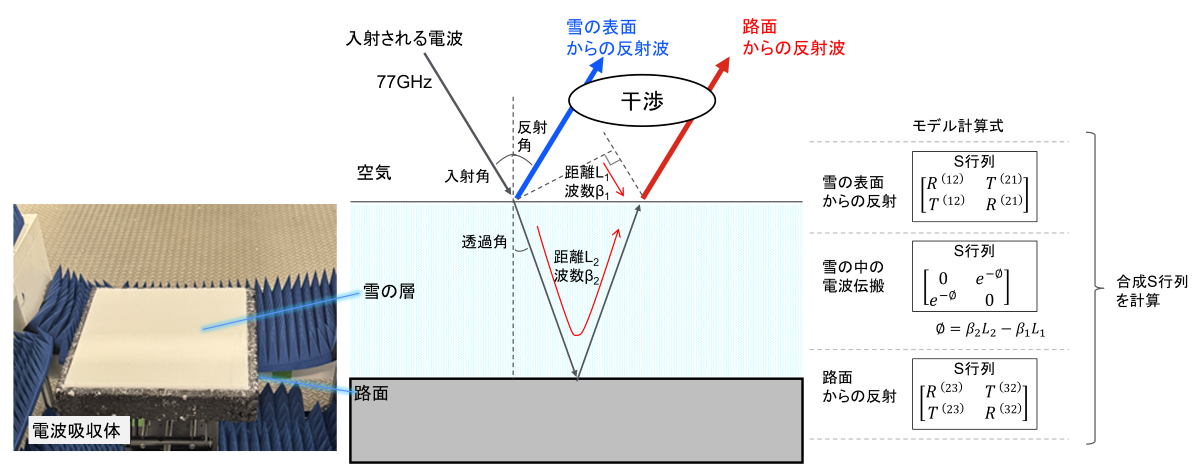 今回我々は、路面の上に積雪があるときの電波の反射を測定するとともに、干渉を含む現象を数式でモデル化しました。電気信号の伝送を計算するときに使われるS行列という計算式を用いて、電波が空気の層から雪の中をとおり路面で反射される現象を数式で計算することができました。路面上に雪が10mm積もっている場合の実験結果とモデル計算結果を図6に示します。実験とモデル計算はよく一致しており、数式モデルが精度よくできていることが分かります。