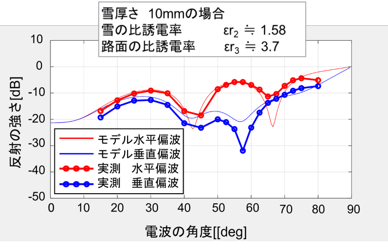 図6 路面に積雪があるときの電波の反射(実測とモデル計算)