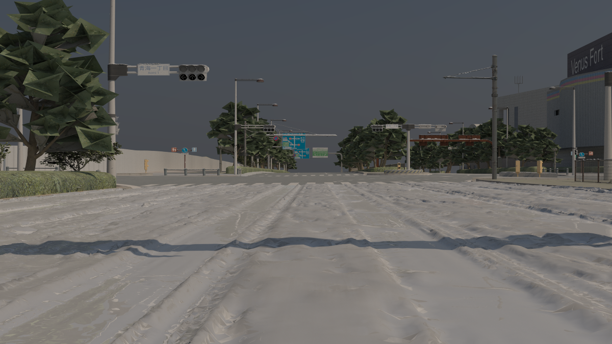 これまでに得られた光の反射特性を使い、仮想空間上に雪景色を描画した例を図7に示します。道路の積雪をポリゴンでモデル化し、雪にたいする光の反射パラメータを適用することで、仮想空間上にわだちのある雪景色を表現しています。