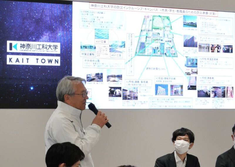 会の冒頭では、本学が厚木市の「指定緊急避難場所」および「指定避難場所」として、地域と協働しながら災害時支援体制の強化に取り組んでいることを紹介しました。 併せて、建物の耐震化100%を達成し、非常時に近隣住民にも対応できる設備を整えるなど、防災拠点としての環境づくりについて説明しました。(当大学の災害対策 - 地域連携災害ケア研究センター)