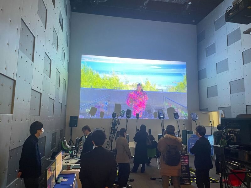 図2:大阪スタジオの8K-3Dプロジェクター/多チャンネルスピーカー配置(参加者は3Dメガネ着用)