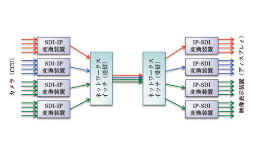 大容量8K 映像データを1台の装置で伝送できる機器はない。そのため、まず8K 映像を縦横に分割して、図2 に示すように、4K 映像(1 台で6Gbpsを伝送可能)をIP で送出する装置を複数並べて並列に伝送を行なう。図2 は、4 台使ってトータル24Gbpsの8K-DG 方式というデータを伝送しているマルチレーン伝送の例である。