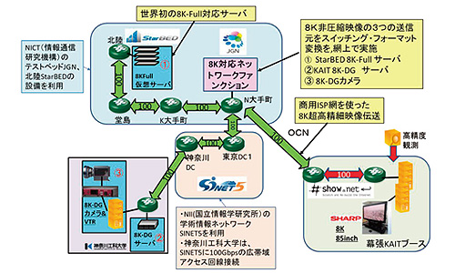 実証実験の1つの例を示す。国内最大のネットワーク技術展示会であるInterop Tokyo 2017 が6 月に幕張メッセで開催され、本学も独自ブースで展示した。この時には、StarBED(北陸)-大阪-東京-神奈川工科大を接続した学術ネットワークと東京(大手町)-会場間にNTT コミュニケーションズ様から提供された商用ネットワークOCNを使い、図7 の構成で広域接続を行った。その環境を用いて、以下の技術を実験展示した。この結果、本技術の優位性が認められて、Best of Show Award の「ShowNet デモンストレーション部門」審査員特別賞を受賞した。